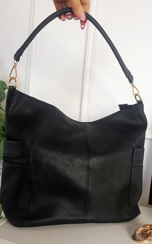 Faux Leather Shoulder Bag with Side Pocket Zip Detail