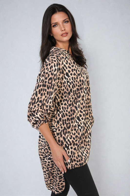 Oversized Leopard Print Button Down Batwing Sleeve Top