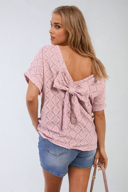 Bow Back Eyelet Details Short Sleeve Oversized Top