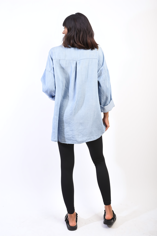 Collared Button Down Long Sleeve Loose Top with Front Pocket