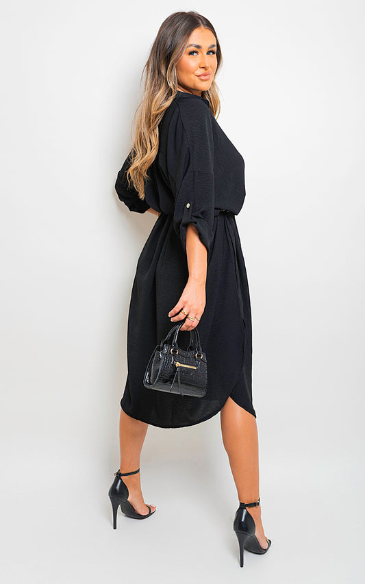 Button Down Pull Up Sleeve Midi Dress with Front Pocket