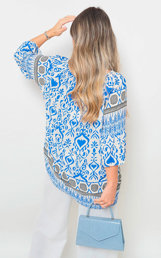 Boho Printed Tassel Tie Neck Long Sleeve Loose Tops