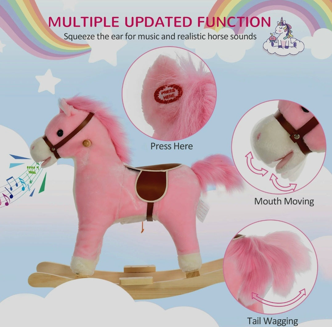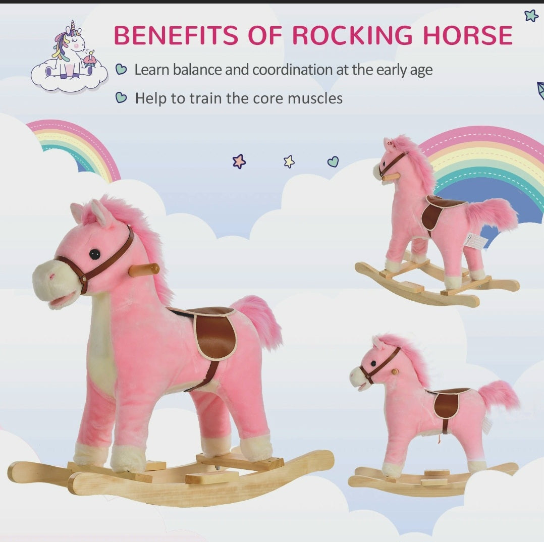 Give your child endless adventure and fun with this rocking horse. Using solid metal for the main frame, moulded into large design and covered in soft plush fabric. It is fitted with a flat seat, a rein and two handlebars for your child to hold on safely. With the squeeze of the ear button, the mouth and tail moves and plays sounds, making it fun and exciting. It's finished with a solid wood base for a smooth gliding motion forwards and backwards.