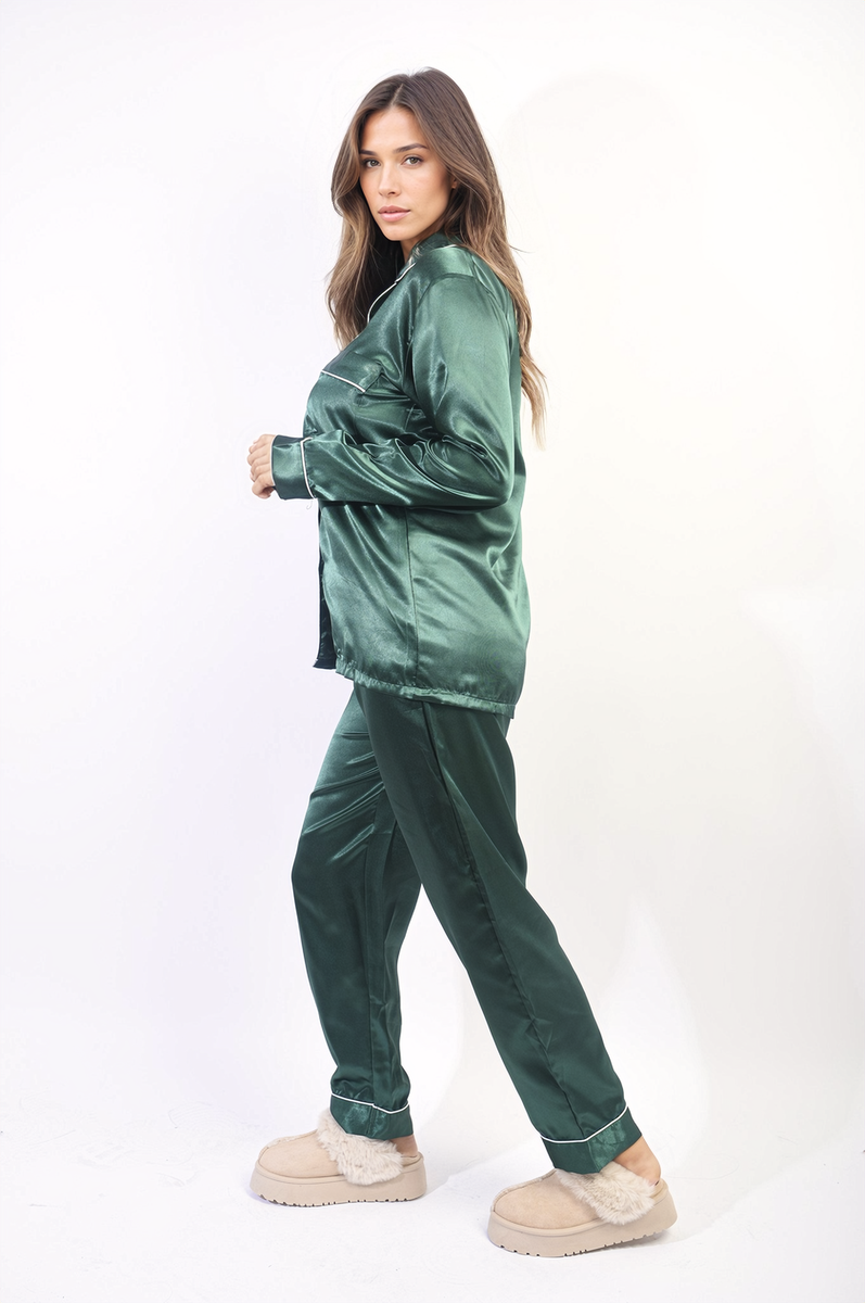 The top features a button-down front 🖲️ with a classic collar, while the trousers have an elastic waistband for a perfect fit. The sleek design and soft shimmer of satin will make you feel like a queen 👑 even in your downtime.