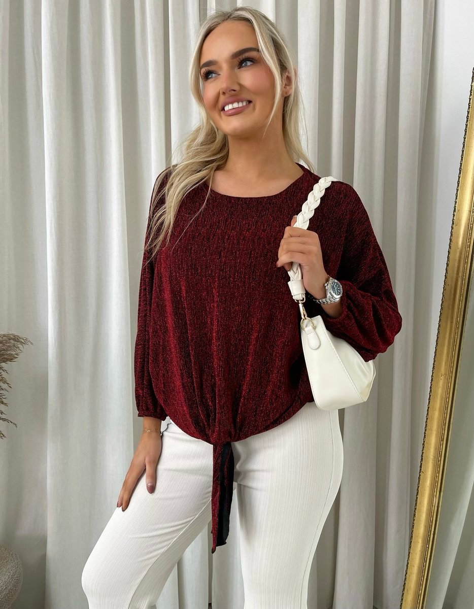 Add a touch of sparkle to your wardrobe with the Katrina Shimmer Long Sleeve Tie Front Top! This stylish top features a shimmering fabric that catches the light beautifully. The long sleeves and cute tie front make it perfect for dressing up or down. Pair with jeans or a skirt for a versatile look that shines!